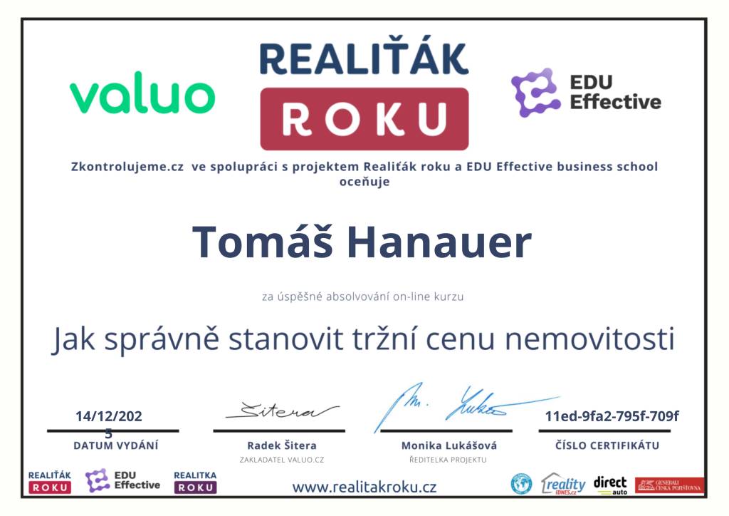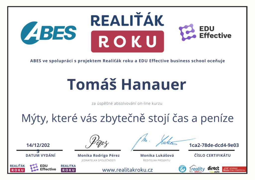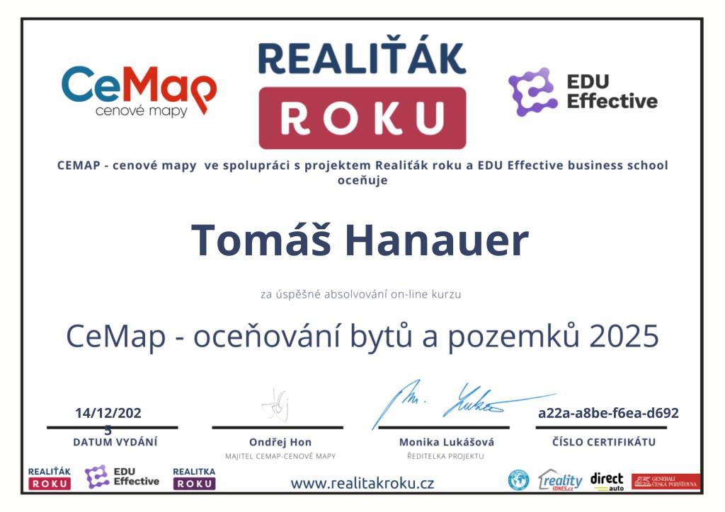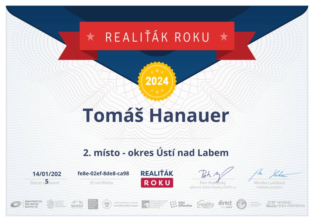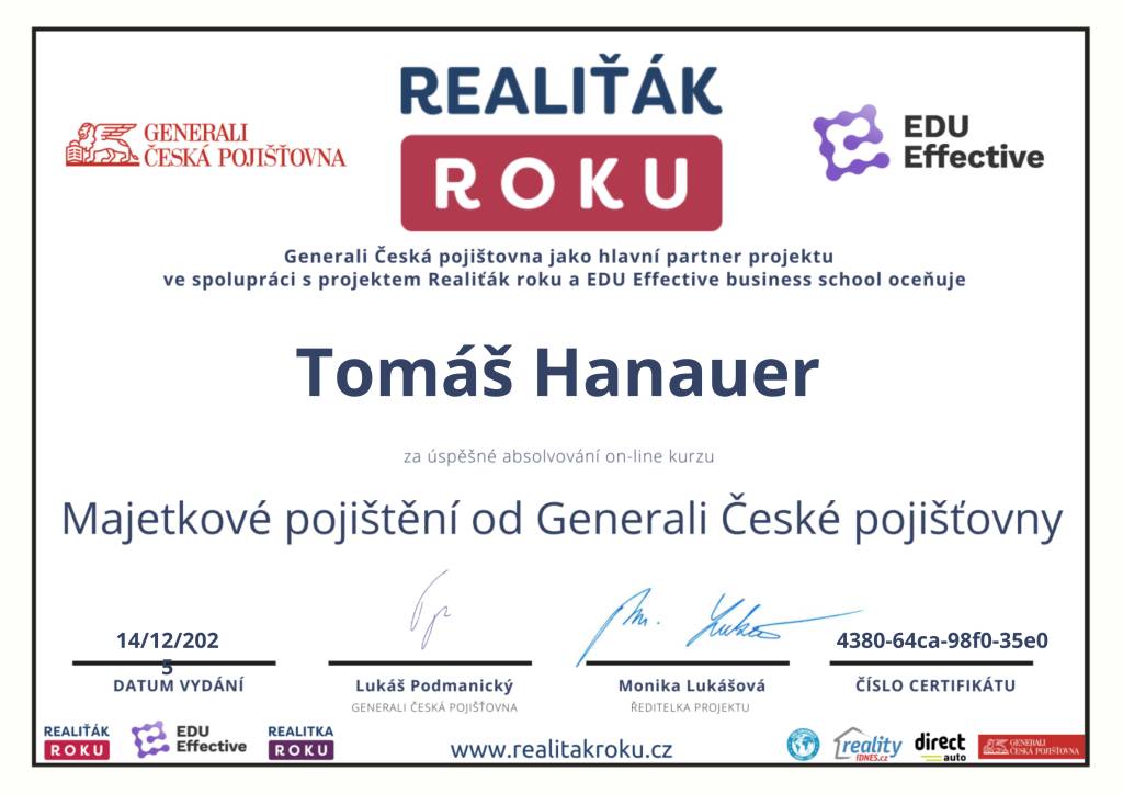 Jmenuji se Tomáš Hanauer, naší společnost Hanauer reality jsem založil v roce 2017, dovolím si říct, že nejsem žádným nováčkem v realitní činnosti. Aktivně se jí věnuji od roku 2008 a do r. 2023 jsem pracoval v jedné z největší české realitní kanceláři, kde jsem prodal a pronajal 848 nemovitostí a kde jsem se mezi 1 227 makléři z celé ČR umístil na 4. místě v celkové produkci. Mým cílem je se neustále posouvat, plnit další cíle a hlavně spokojený klient je u mě na prvním místě.