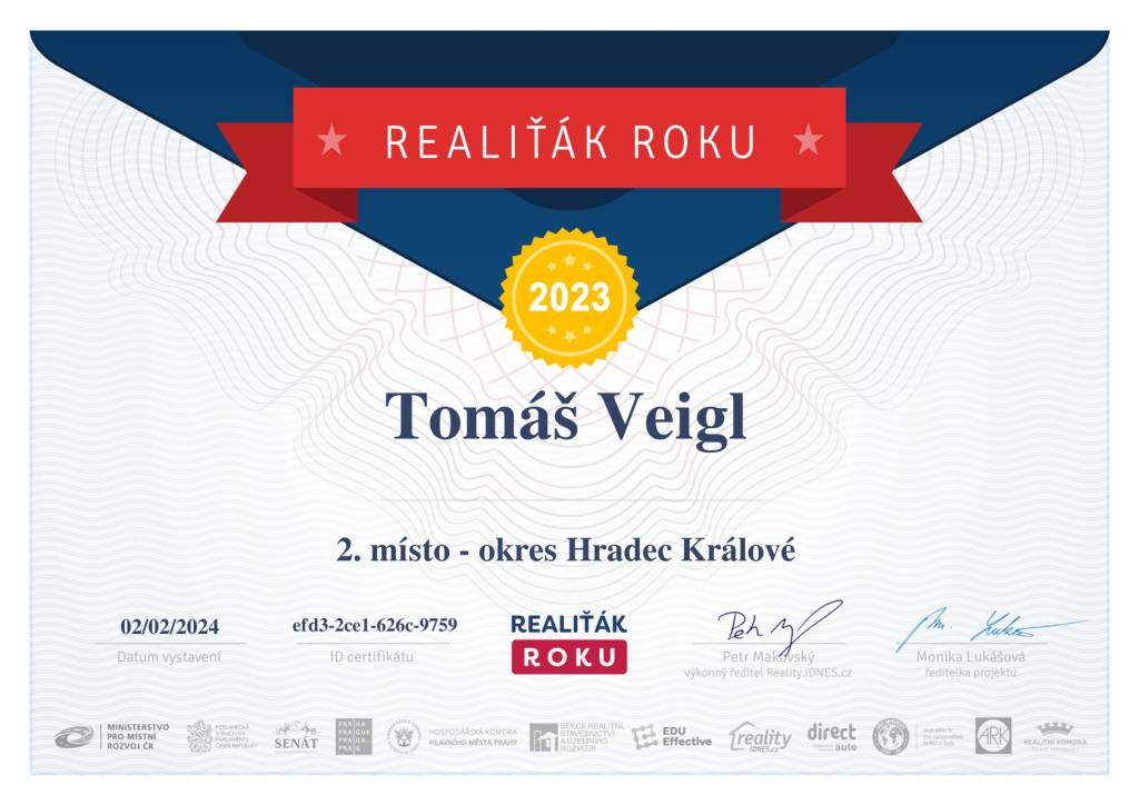 Chtěl bych touto cestou poděkovat panu Veiglovi a jeho manželce za bezvadný přístup při koupi domu i prodeji bytu. Vše bylo jak časově tak technicky velice náročné. Obě místa od sebe vzdálena skoro 50 km, korigovat termíny prohlídek, hypotéka, paní advokátka a předávání všemožných dokumentů a podpisů v trojúhelníku Neratovice - Velké Chvalovice - Tetov (respektive Pardubice). Vše proběhlo k naprosté spokojenosti. Přístup který se vidí málo a troufám si říct, že u velkých realitních kanceláří téměř vůbec. Bylo to dlouhé a náročné, ale jsme ve finále a to jen díky Vám a vaší paní. Velice děkujeme za vše co jste pro nás udělali a věřím, že za těch téměř třičtvrtě roku se z nás stali v podstatě přátelé a neviděli jsme se naposledy.