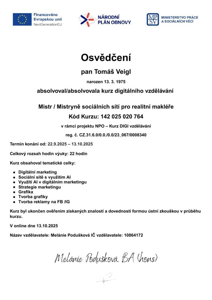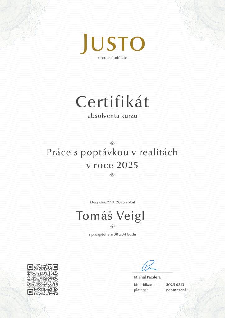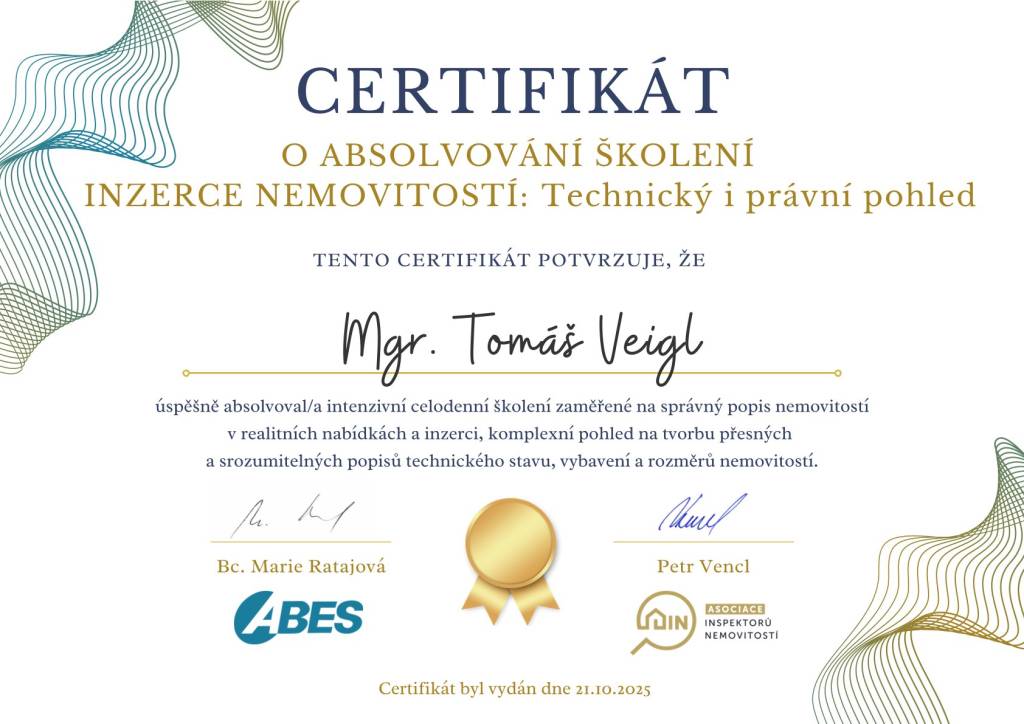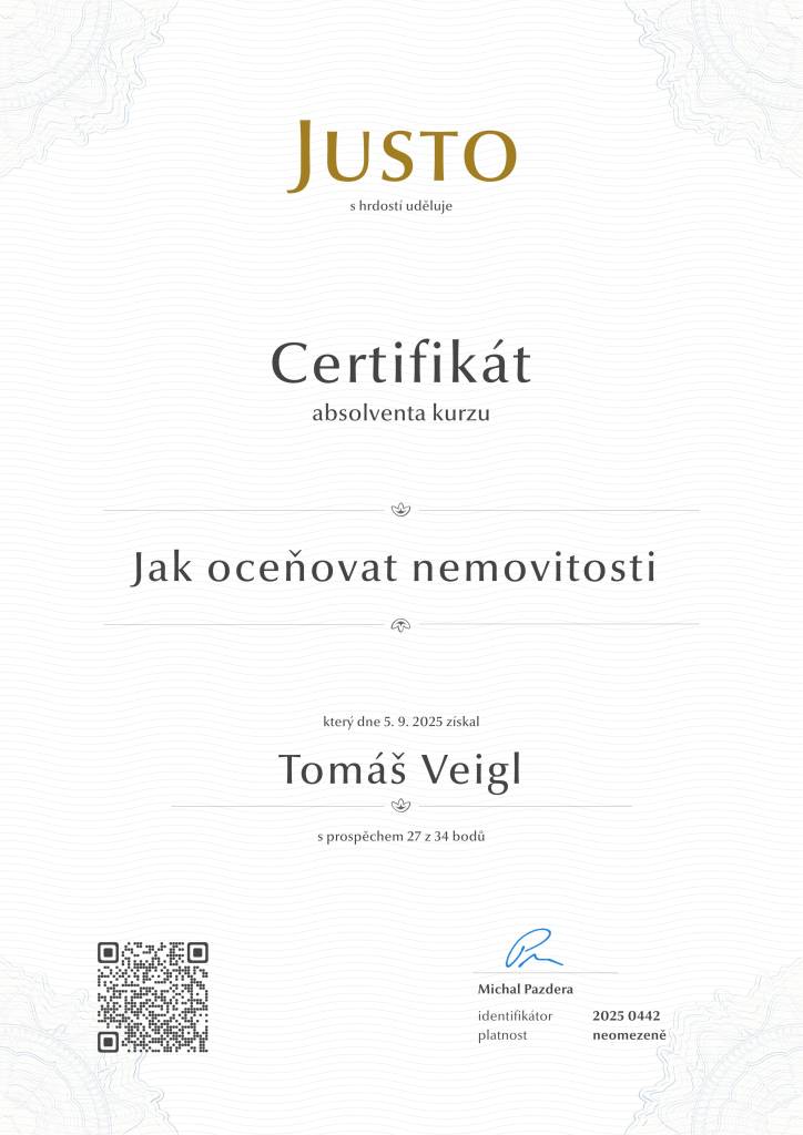 Ráda bych vyjádřila velikou spokojenost a poděkování panu Mgr. Veiglovi za jeho profesionální přístup, výbornou komunikaci, komplexní služby od přípravy a zadání nabídky až po podepsání smlouvy o prodeji bytu. Pan magistr mi pomohl vyřešit i další věci okolo prodeje, které bych sama řešila poměrně komplikovaně. Mohu jen vřele doporučit. Zdeňka Čermáková