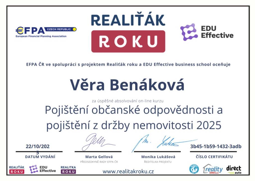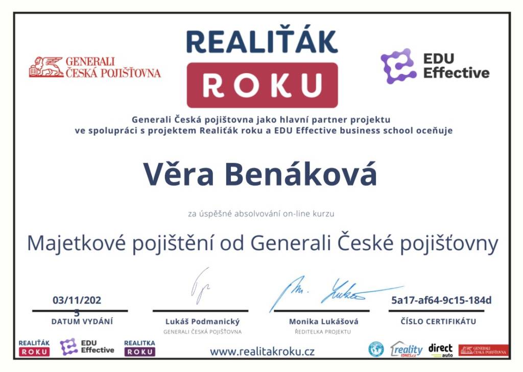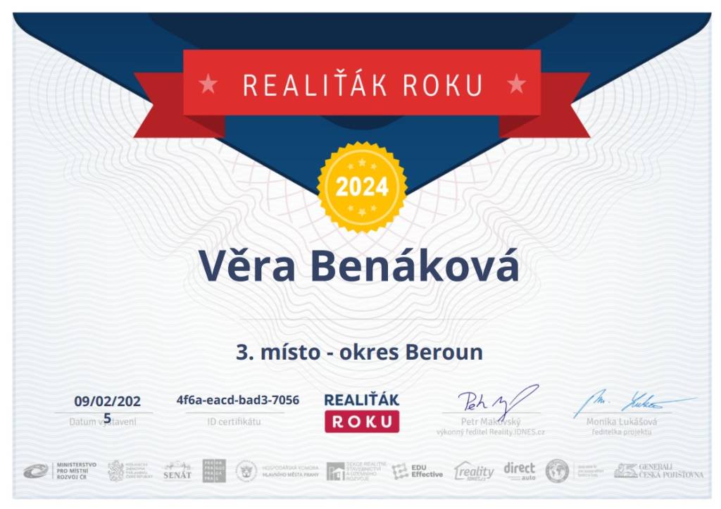 Jmenuji se Věra Benáková, profesionál v oblasti realitního trhu a zakladatelka společnosti VeraEstate s.r.o. Oblastí působení je Praha, Beroun a Střední Čechy. Specializuji se na prodej a nákup nemovitostí, známá svým lidským a zároveň profesionálním přístupem ke klientům. Kladu si za cíl být oporou každého klienta při realizaci a řešení finančních situací a důkladná péče o klienty. Patřím mezi certifikované profesionály v oboru. Hlavní prioritou je spokojenost klienta se snahou najít optimální řešení pro každého.
