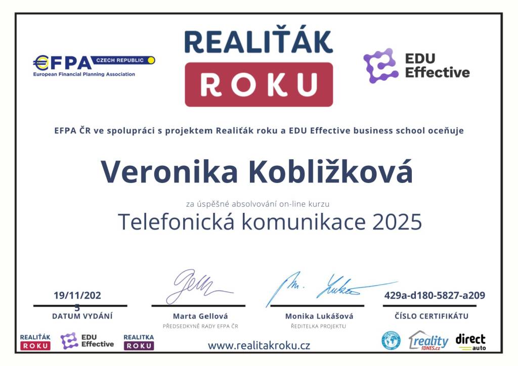 "K realitám mě přivedla vášeň pro práci s lidmi a jejich příběhy. Každý prodej či koupě je jedinečný, a proto ke klientům přistupuji individuálně a s maximální péčí. S pomocí našeho týmu zprocesuji celý prodej nebo koupi nemovitosti, včetně převodů energií a pomoci s financemi. Moji klienti nejsou jednorázoví – i po skončení obchodu se na mě mohou obrátit, kdykoliv potřebují radu či pomoc."