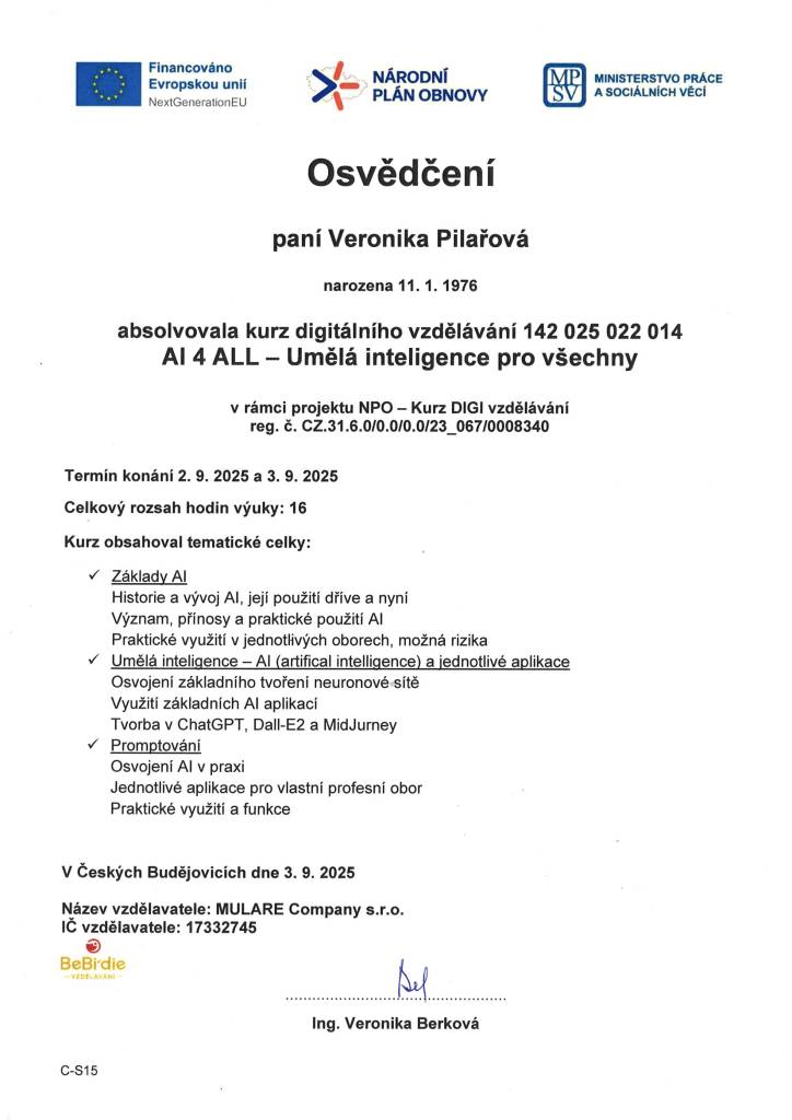 Dekuji Veronice Pilařové za odborný a profesionální přístup. Rychlá reakce a okamžitá orientace v řešení poptávky ze strany zadavatele.