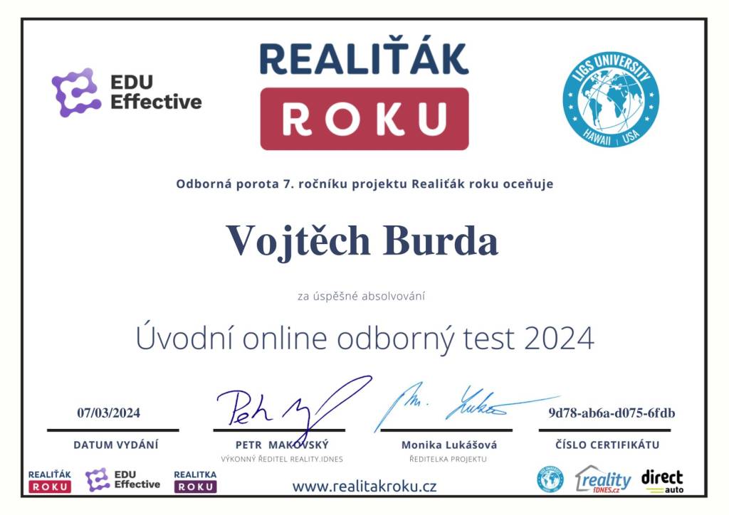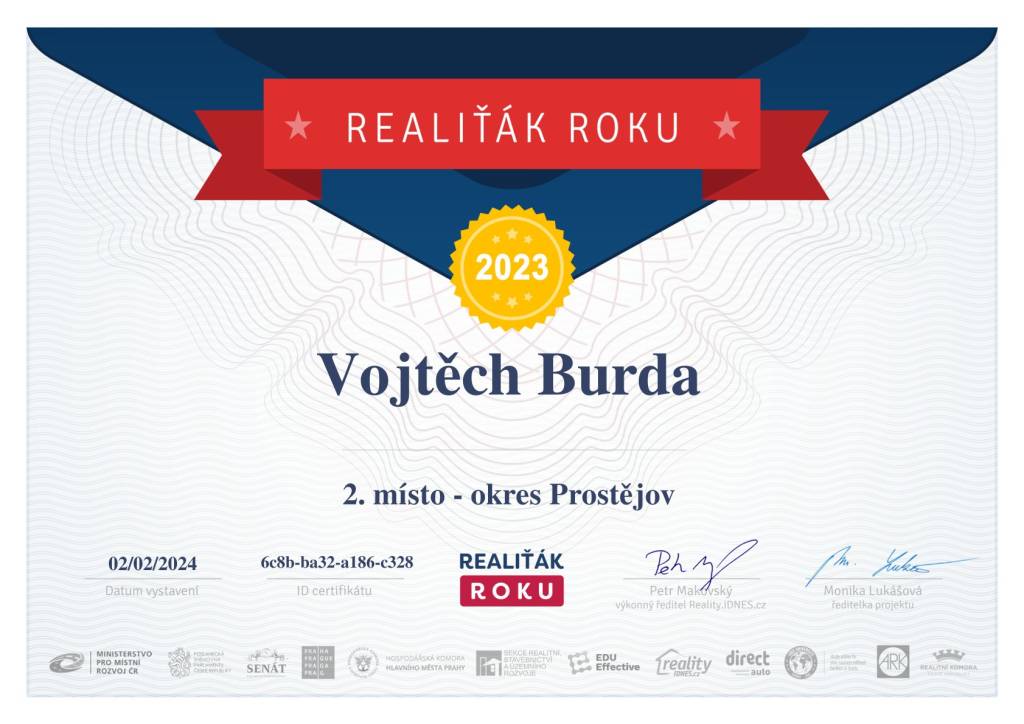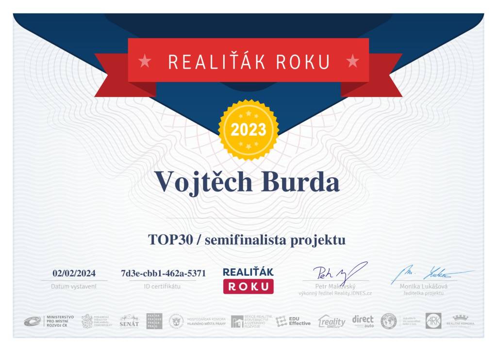 "Chtěl bych vyzdvihnout skvělé jednání makléře který nás měl na starost. Pan Vojtěch BURDA je velice sympatický makléř jednání s ním hodnotím velice kladně, profesionální přístup a ochota vše na jedničku. Velmi doporučuji tohoto makléře."