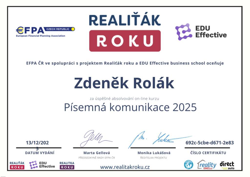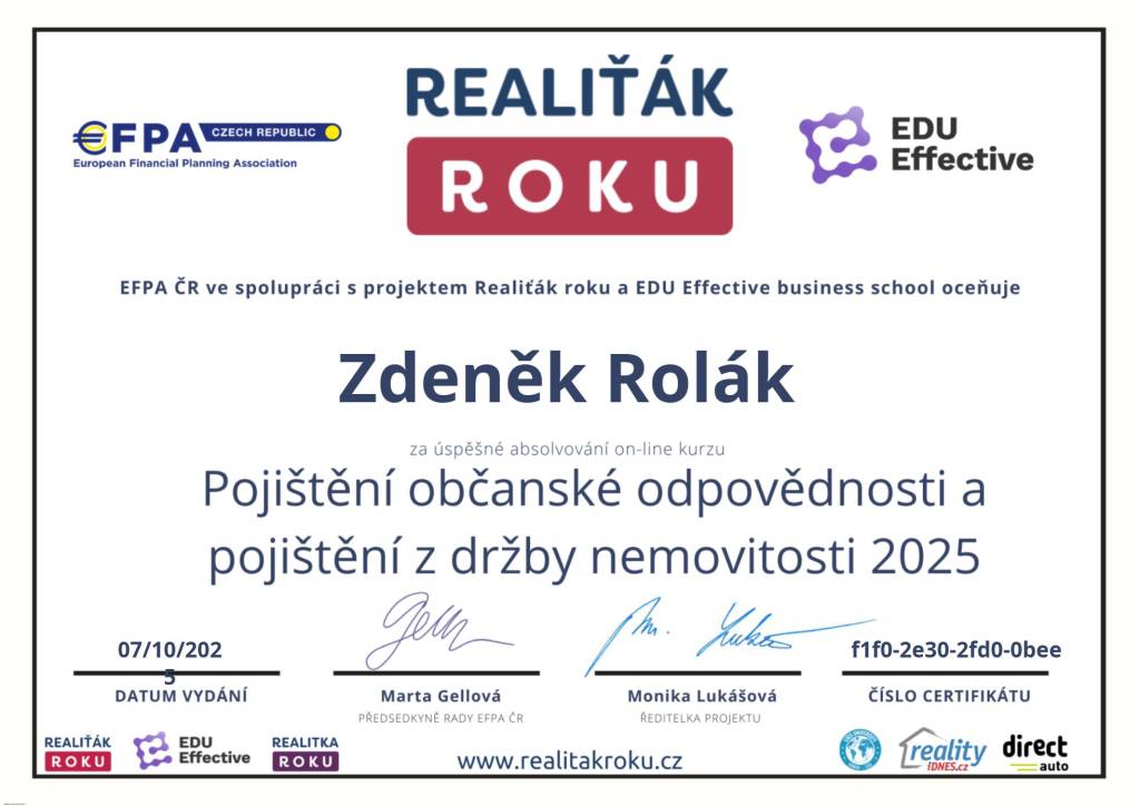 Ráda bych touto cestou poděkovala panu Zdeňku Rolákovi za skvělou práci při zprostředkování pronájmu mého bytu. Pan Rolák byl od začátku velmi vstřícný, férový a srozumitelně nám vysvětlil všechny kroky a detaily celého procesu. Jeho znalost trhu, právních aspektů a obchodních praktik v oblasti nemovitostí svědčí o jeho vysoké profesionalitě.