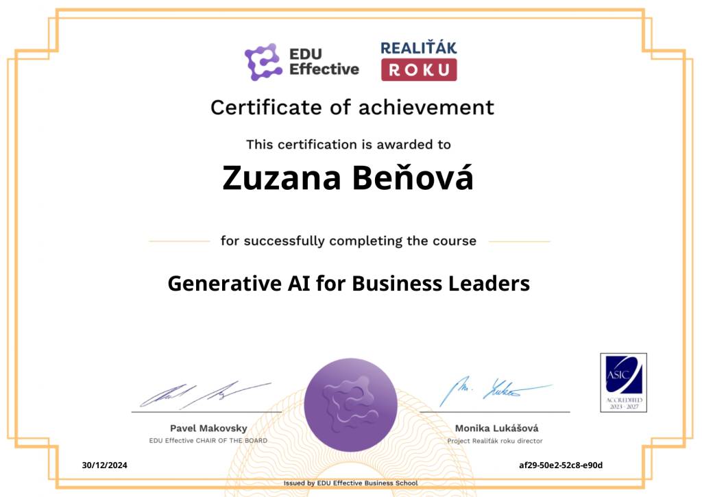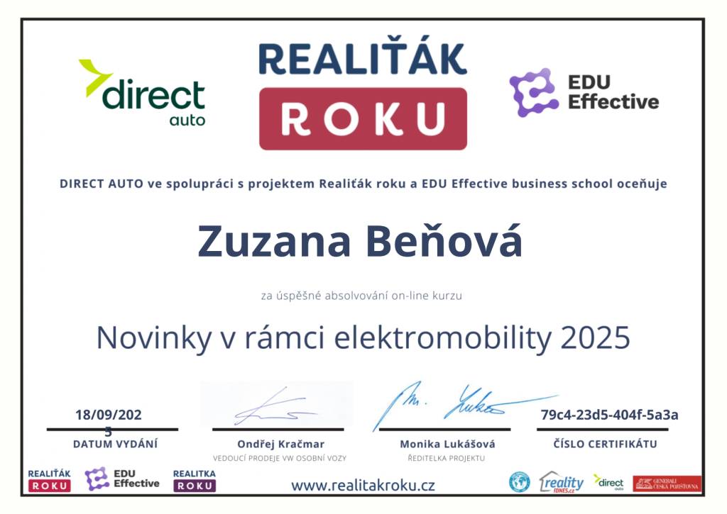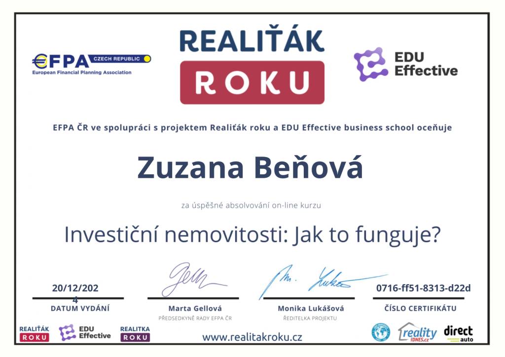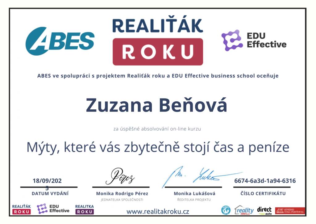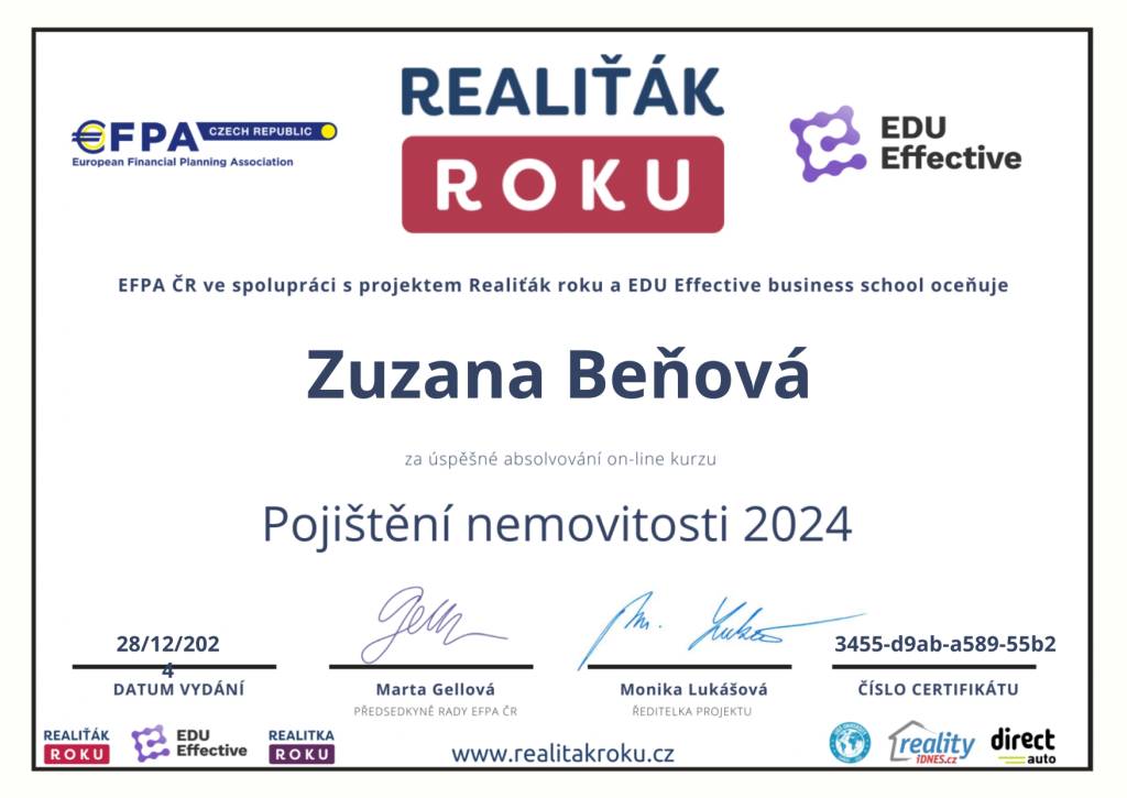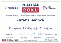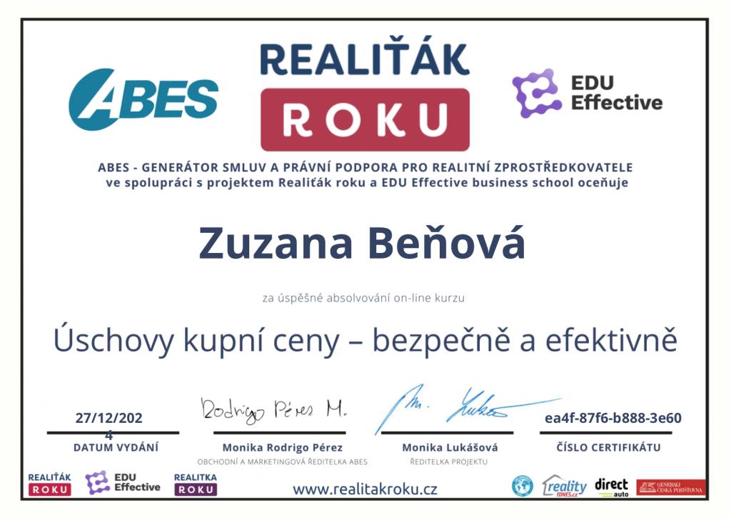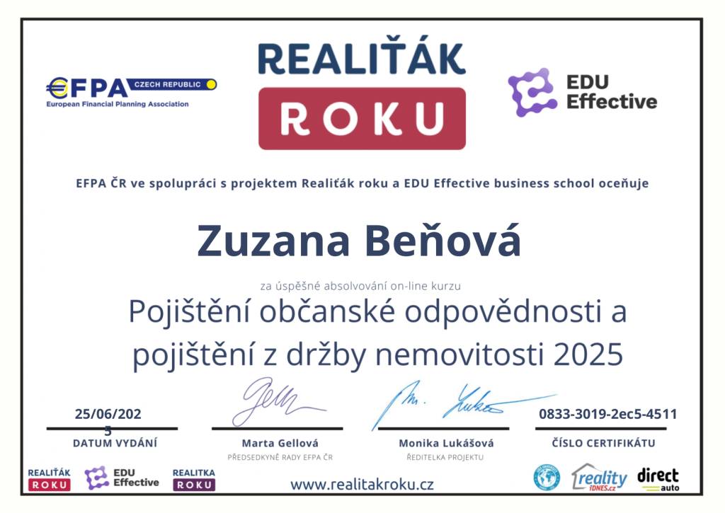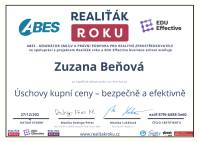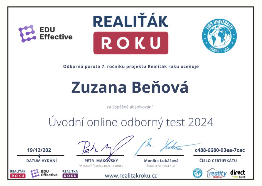 Rád bych vyjádřil své poděkování skvělé realitní makléřce Zuzaně Beňové! Spolupráce s ní předčila všechna má očekávání. Již od první komunikace bylo jasné, že mám před sebou skutečného profesionála: pozorného, zodpovědného, upřímně zainteresovaného na výsledku a prostě neuvěřitelně milého člověka. Byla vždy v kontaktu, pohotově odpovídala na všechny dotazy, poskytovala cenné rady a pomáhala mi vyhnout se nástrahám. Celkově nejlepší makléřka, jakou jsem kdy potkal.